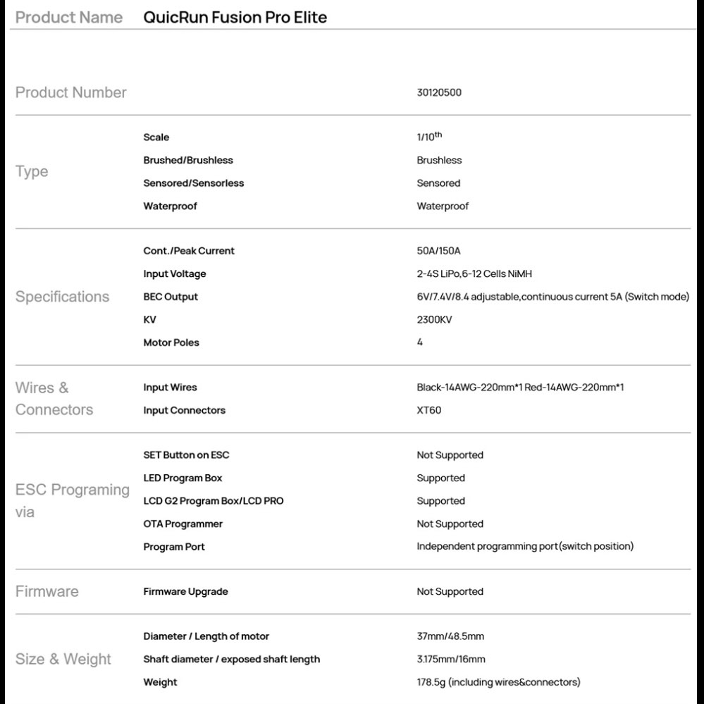 QuicRun Fusion Pro Elite 50A 2300KV QuicRun Fusion Pro Elite 50A 2300KV (HW-01) QuicRun Fusion Pro Elite 50A 2300KV ESCとブラシレスモーターが一体型の2in1システム 別売のプログラムカードで簡単にESCセッティングが可能 ロッククローリング走行で必要な超低速走行も可能です。 QuicRun Fusion Pro Elite 50A 2300KV 在庫状態 : 在庫有り ¥22,000(税込) 数量 LED Program Box 在庫状態 : 在庫有り ¥2,200(税込) 数量
